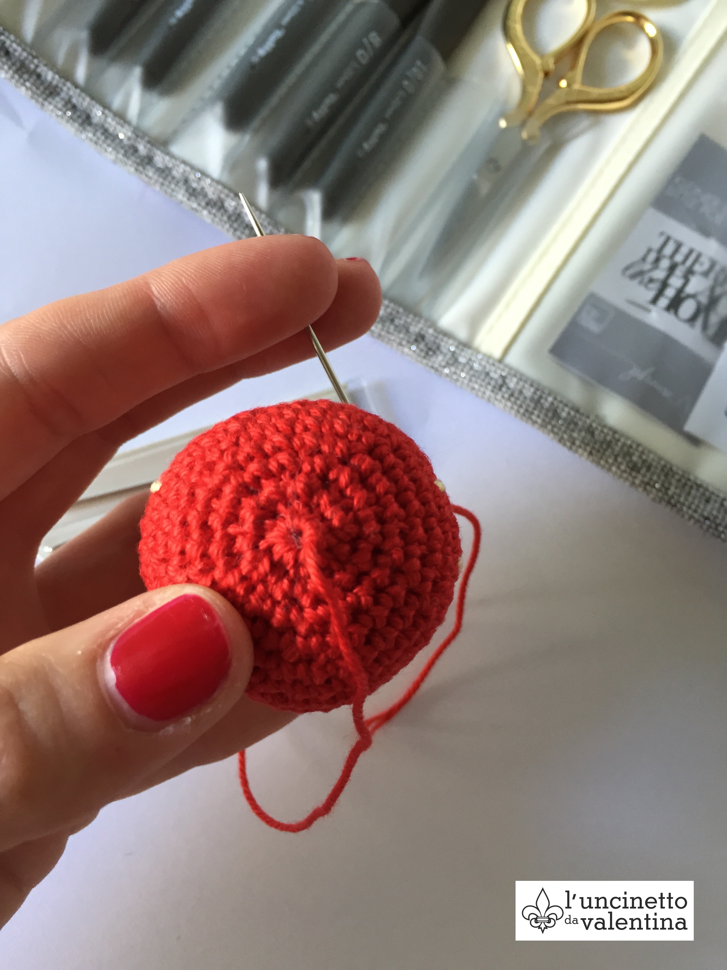 Die Arbeit auf links drehen und den Magischen Kreis fest zuziehen, den Faden verknoten.