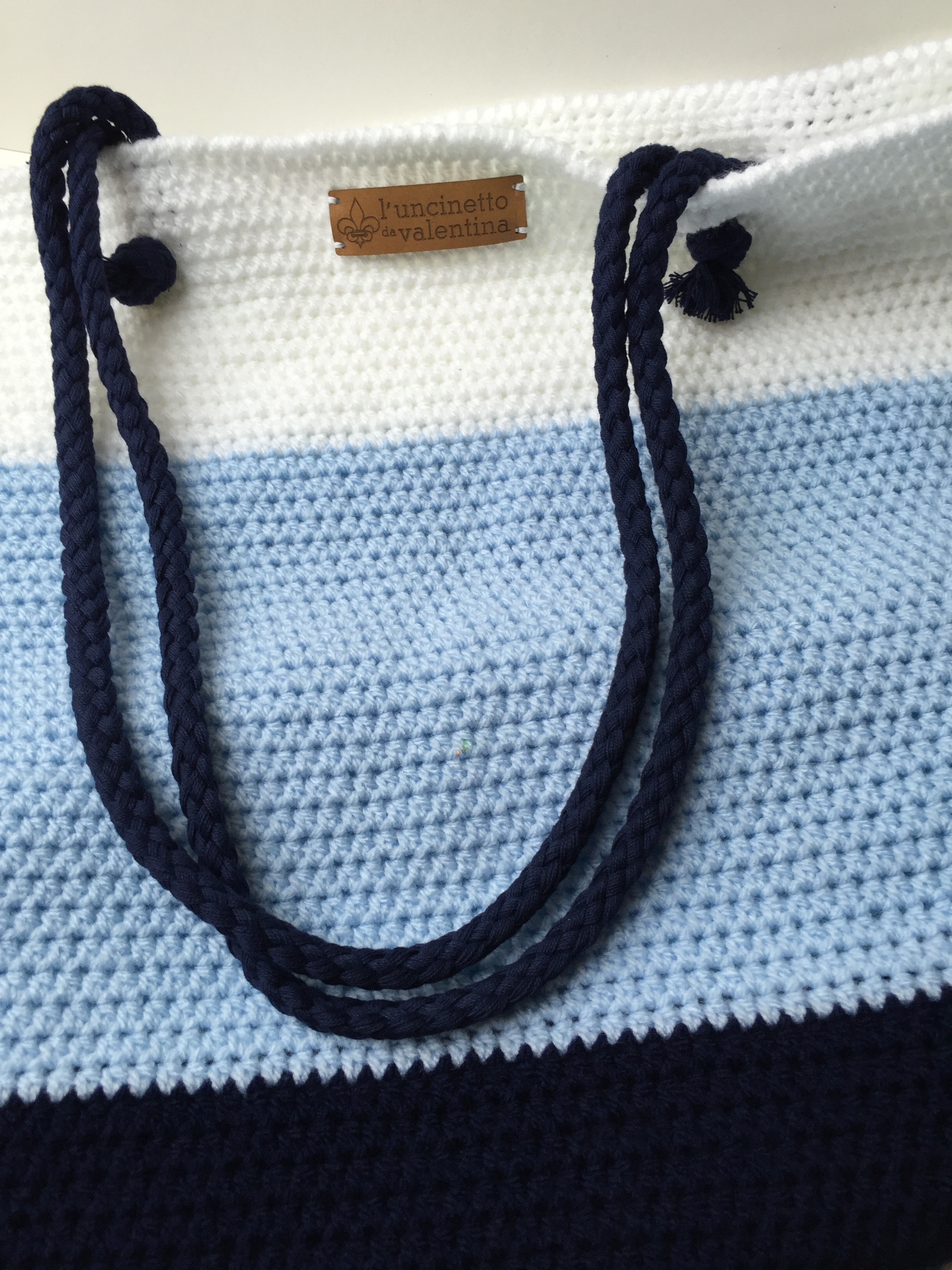 Wie weit seid ihr? Jetzt geht es hier um die Taschengriffe und ein paar der vielen verschiedenen Möglichkeiten, sie an die Tasche zu bringen. Ich habe eine einfache Variante gewählt und die gekaufte Kordel in zwei Teile geschnitten, unter der dritten Reihe durch die Maschen gezogen und verknotet.