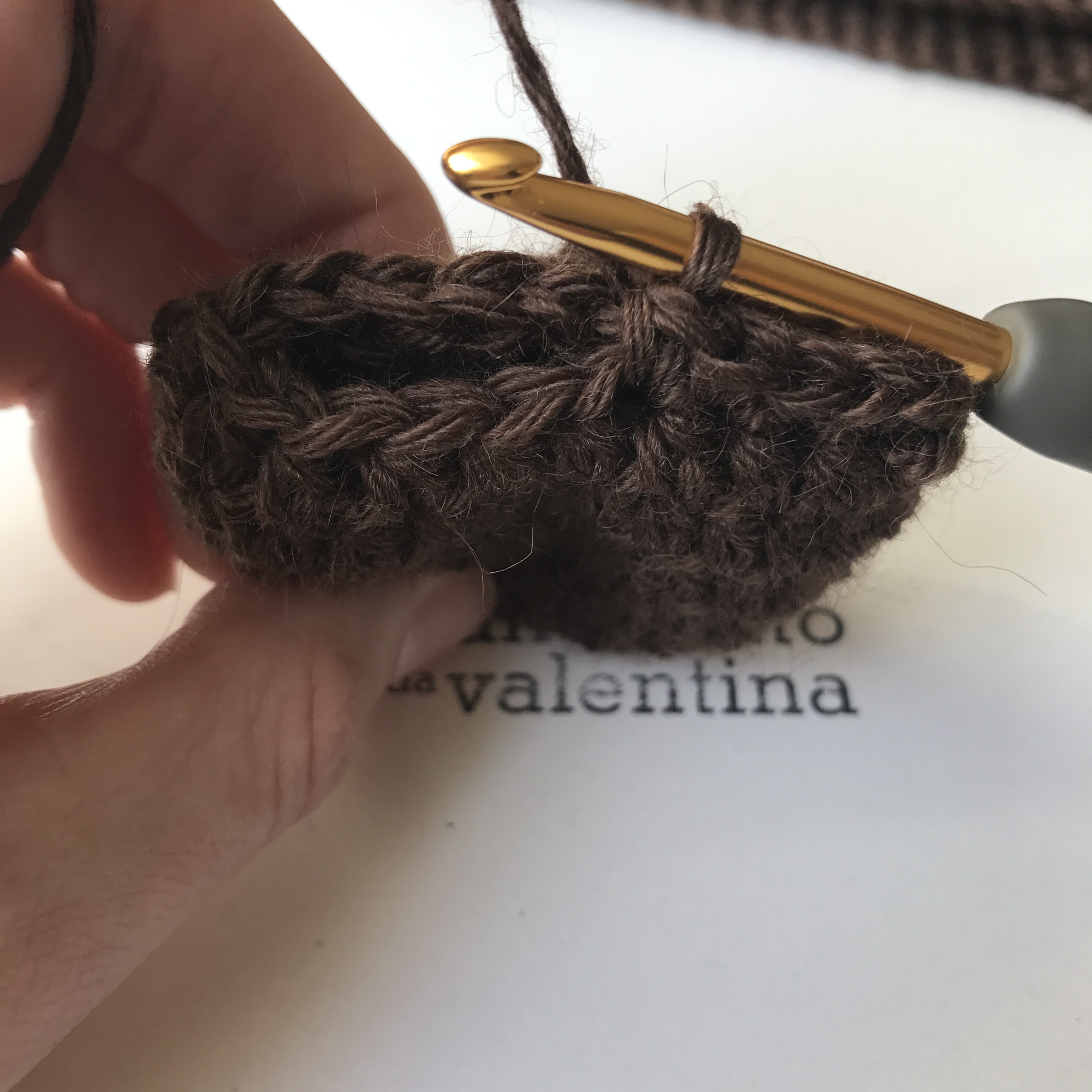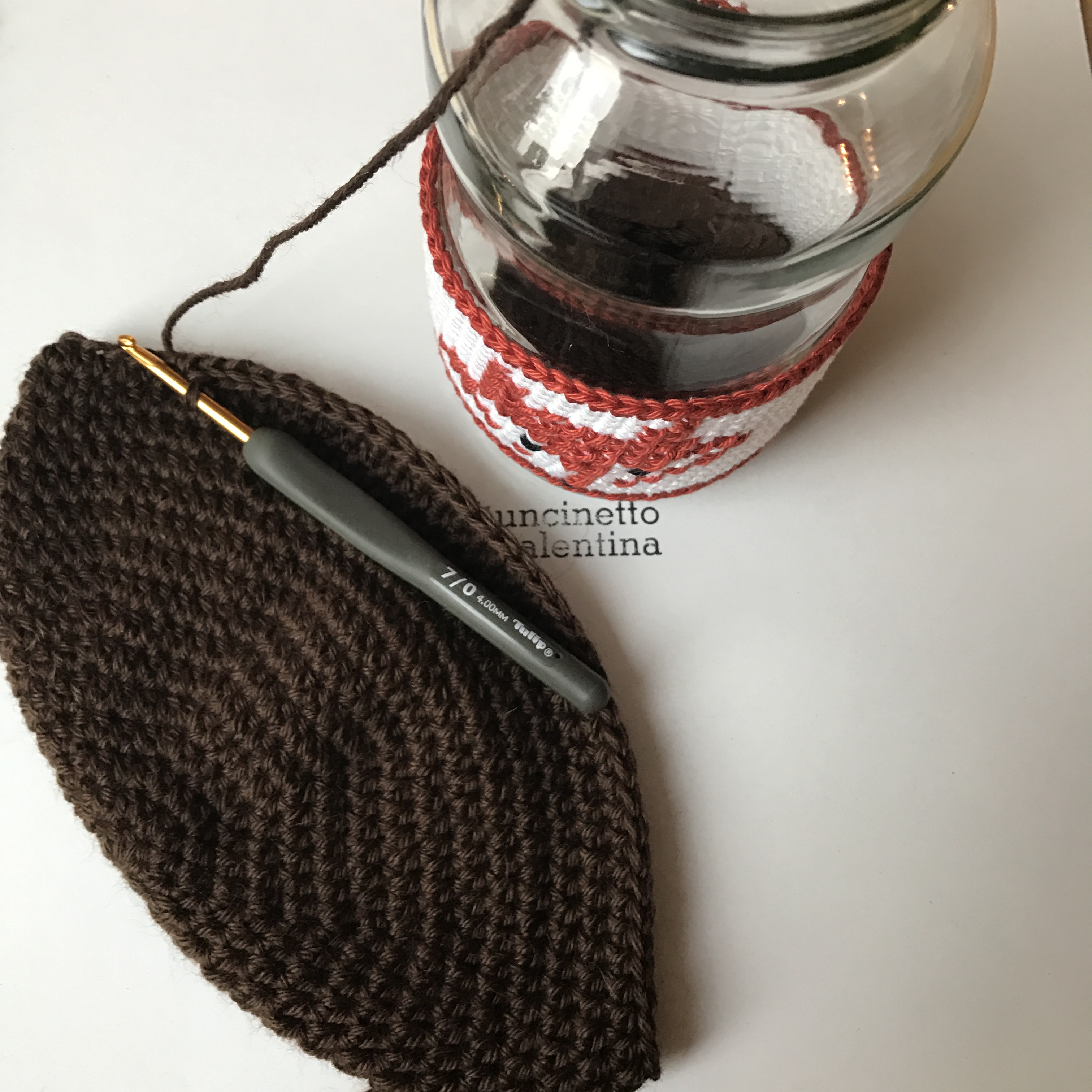 Nun kommen die Ohren. Diese werden auch aus halben Stäbchen und in Spiralrunden gehäkelt.