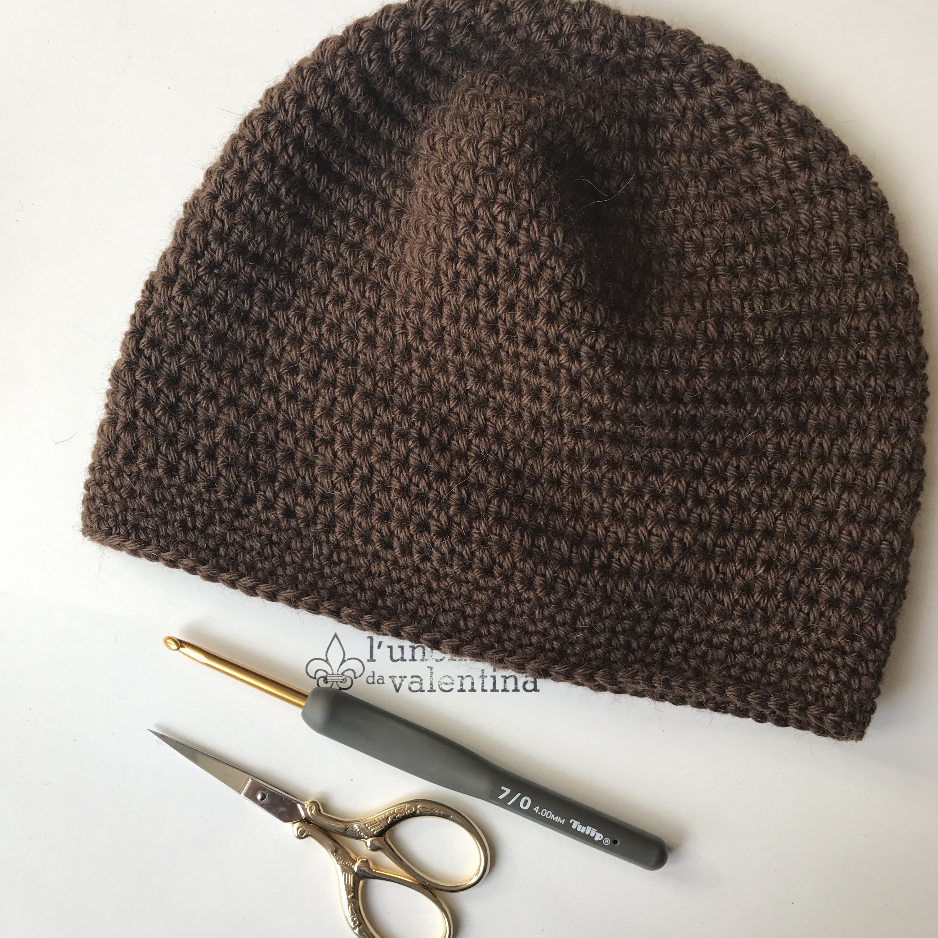 Meine Mütze habe ich in Spiralrunden aus halben Stäbchen mit einer 4er Nadel gehäkelt. Die erste Masche einer Runde bitte markieren.