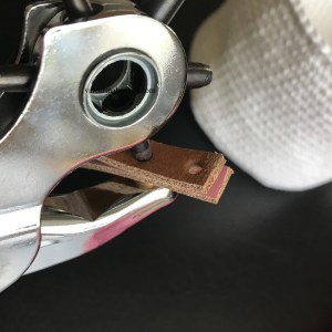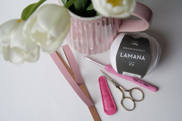 In den Lederriemen habe ich mit einer Gürtelloch Zange an jedes Ende zwei Löcher gestanzt. Alternativ könnt ihr auch einen alten, schmalen Gürtel nehmen oder aus dem restlichen Garn ein Band häkeln.
