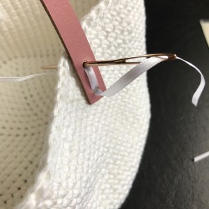 Mit einem schmalen Satinband habe ich den Lederriemen dann am Körbchen befestigt. *** psst, kleiner Geheimtipp *** Diese schmalen Bändchen schneide ich immer aus den Schultern von Oberteilen und hebe diese auf. 😉 Eignen sich auch prima als Schleife z. B. für meine Eierwärmer mit Ohren. 😀