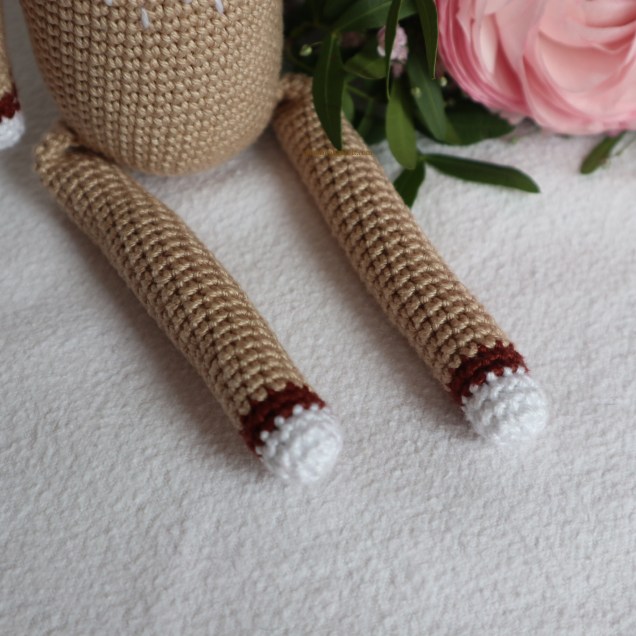 - Beine mit Watte füllen, flach falten, mit fm zusammenhäkeln.