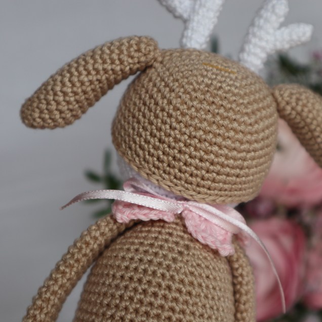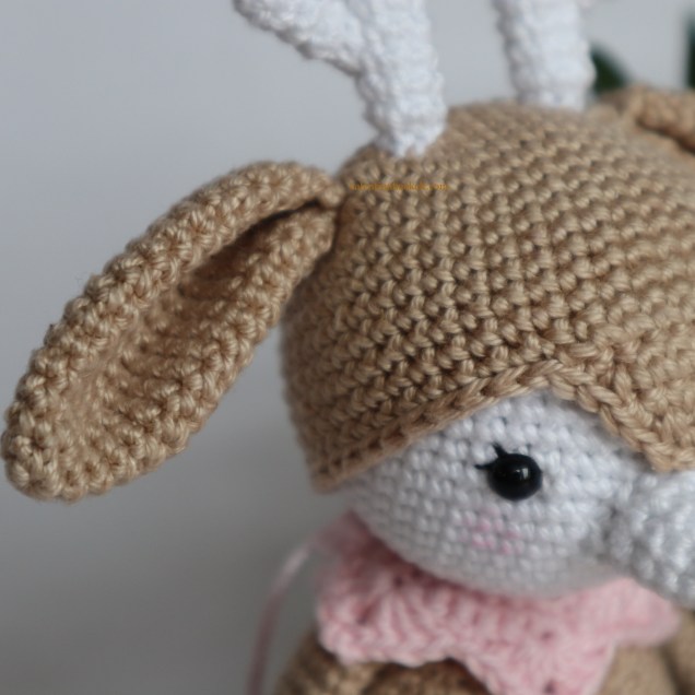 - 1 km; Ohren falten und mit 7 fm zusammenhäkeln; Faden lang lassen.