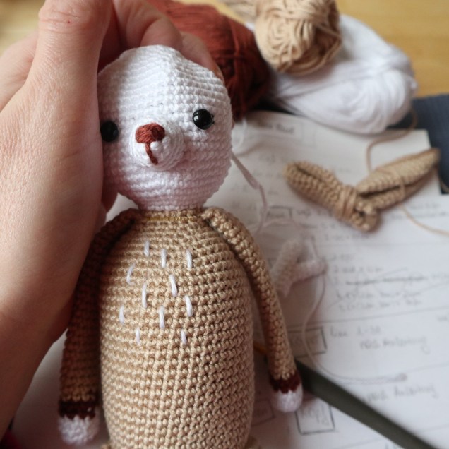 - 1 km, Faden länger lassen. Mit braun die Nasenspitze besticken.