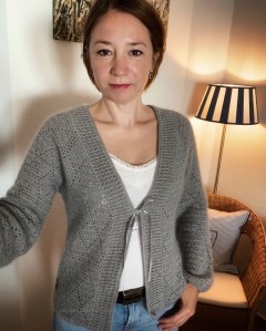 Verschluss: Wer mir auf Instagram folgt, hat vielleicht meine vielen Versuche einen geeigneten Verschluss zu finden, verfolgt. Mein erster Versuch mit den Druckknöpfen ging voll in die Hose, weil die zarte Wolle viel zu leicht war und dem Zug irgendwann nicht mehr standgehalten hätte. Zumal die Knöpfe einfach unschön abstanden. Dem Fehlversuch folgten einige andere mit Knöpfen aller Art. Zum Schluss habe ich einfach dünne Bänder angenäht und bin damit sehr zufrieden, weil sie auch hervorragend mit dem Cardigan harmonieren.