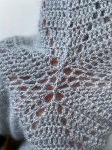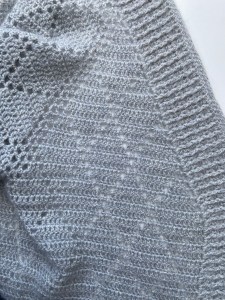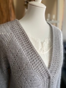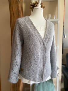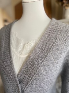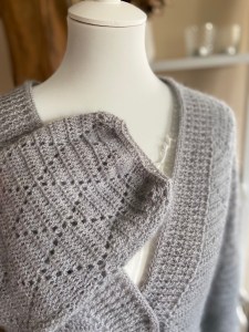 Der Cardigan wird in Reihen gehäkelt. Ebenso die Ärmel, um ein einheitliches Maschenbild zu erreichen. Zum Schluss werden die Ärmel von der Achsel bis zum Bündchen zusammengenäht und das Bündchen gehäkelt.