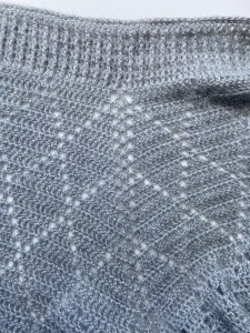Blende: In jedes Randstäbchen zwei Stäbchen häkeln. Bei den Ärmeln und dem Halsausschnitt ein Stäbchen in jedes Stäbchen und in jede Luftmasche der ersten Reihe häkeln. In den nächsten Reihen im Wechsel eine Reliefmasche und ein Stäbchen häkeln. Damit erzielt man den gerippten Effekt. So lange fortführen, bis die gewünschte Breite erreicht ist. Ich habe zum Schluss noch eine Reihe feste Maschen gehäkelt, damit die Blende sich nicht weitet. Im Halsbereich habe ich alle drei Maschen zwei zusammengehäkelt, damit die Blende nicht absteht.
