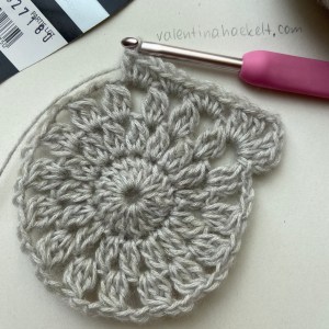 Runde 3: 1 Kettmasche in den ersten Luftmaschenraum der Vorrunde. 2 Luftmaschen, 2 halb abgemaschte Stäbchen, Luftmaschen und Stäbchen zusammen abmaschen = 3 zusammen abgemaschte Stäbchen. 2 Luftmaschen häkeln. *In die Luftmasche der Vorrunde 3 zusammen abgemaschte Stäbchen häkeln. 2 Luftmaschen.* Die Anweisungen in den Sternchen bis zum Ende wiederholen. Runde mit einer Kettmasche in die ersten abgemaschten Stäbchen schließen.