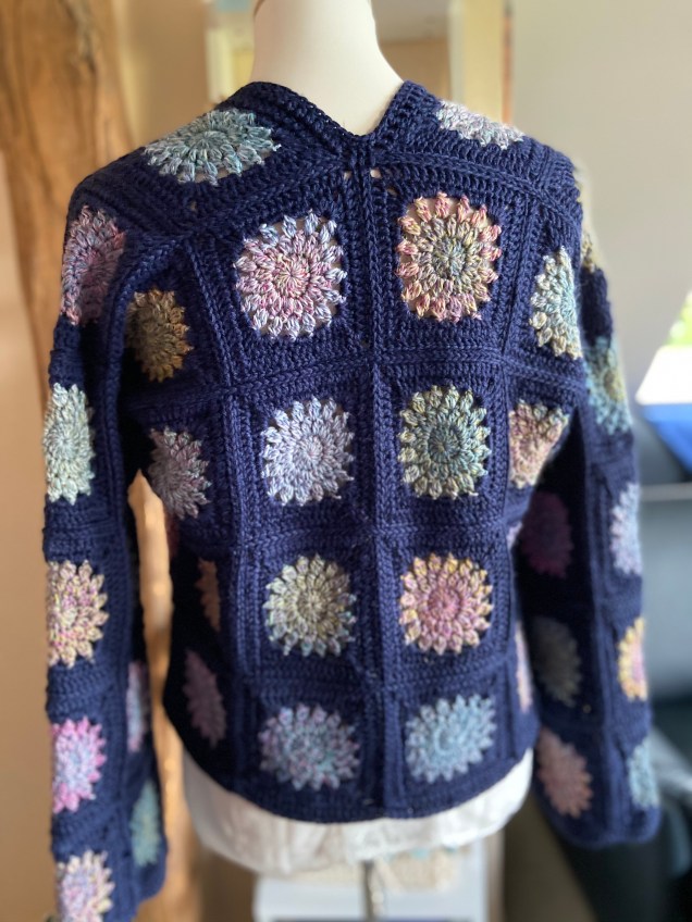 So, das erste Granny wäre fertig. Folgen noch, ja wie viele folgen denn noch? Das lässt sich recht einfach ausmessen/ausrechnen. Ich habe mir dafür eine Strickjacke ausgesucht in den Maßen, die etwa der fertige Cardigan haben sollte. Ein Pullover funktioniert aber auch dafür. Nun kann man mit dem Quadrat die Weiten und Längen „abgehen“ und zusammenrechnen, welche Menge benötigt wird. Ich würde hier empfehlen, etwas großzügiger zu rechnen. Der Cardigan darf ruhig locker sitzen. Meine Quadrate hatten übrigens eine Größe von etwa 11 cm.