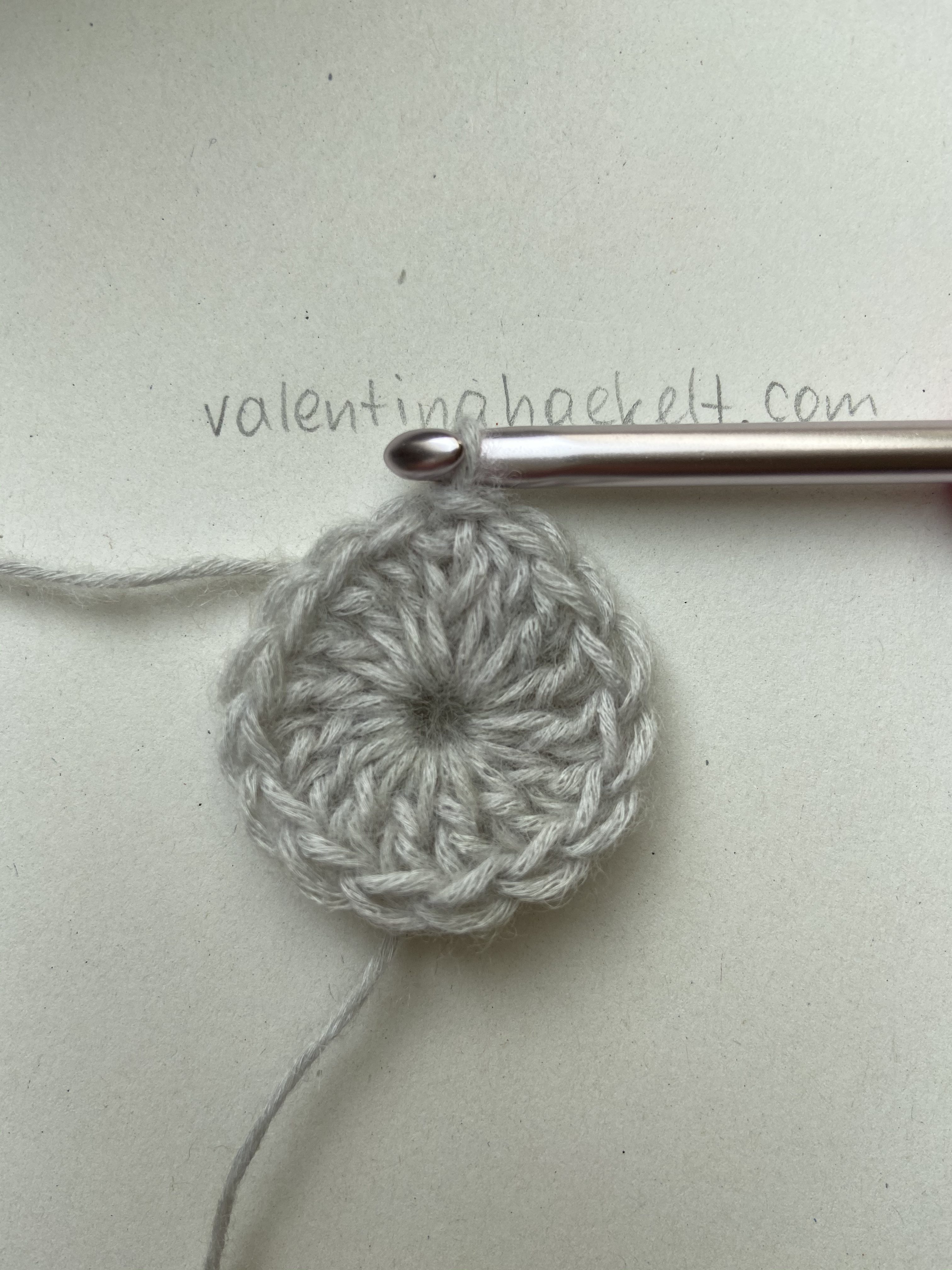 Runde 1: Bilde einen Maschenring, häkle in diesen 3 Luftmaschen und 15 Stäbchen = zusammen 16 Stäbchen. Die Runde mit einer Kettmasche in die 3. Luftmasche vom Anfang schließen.