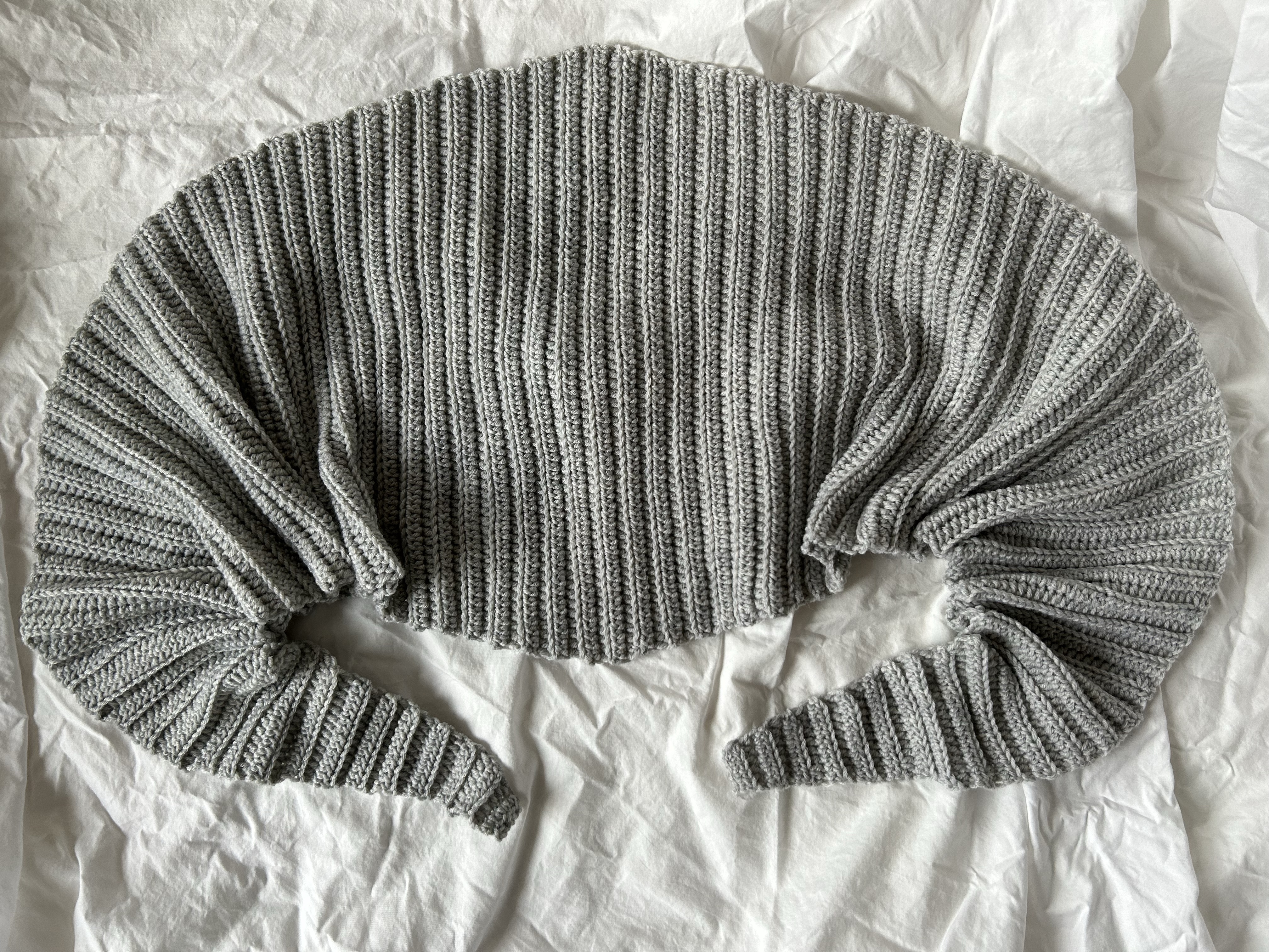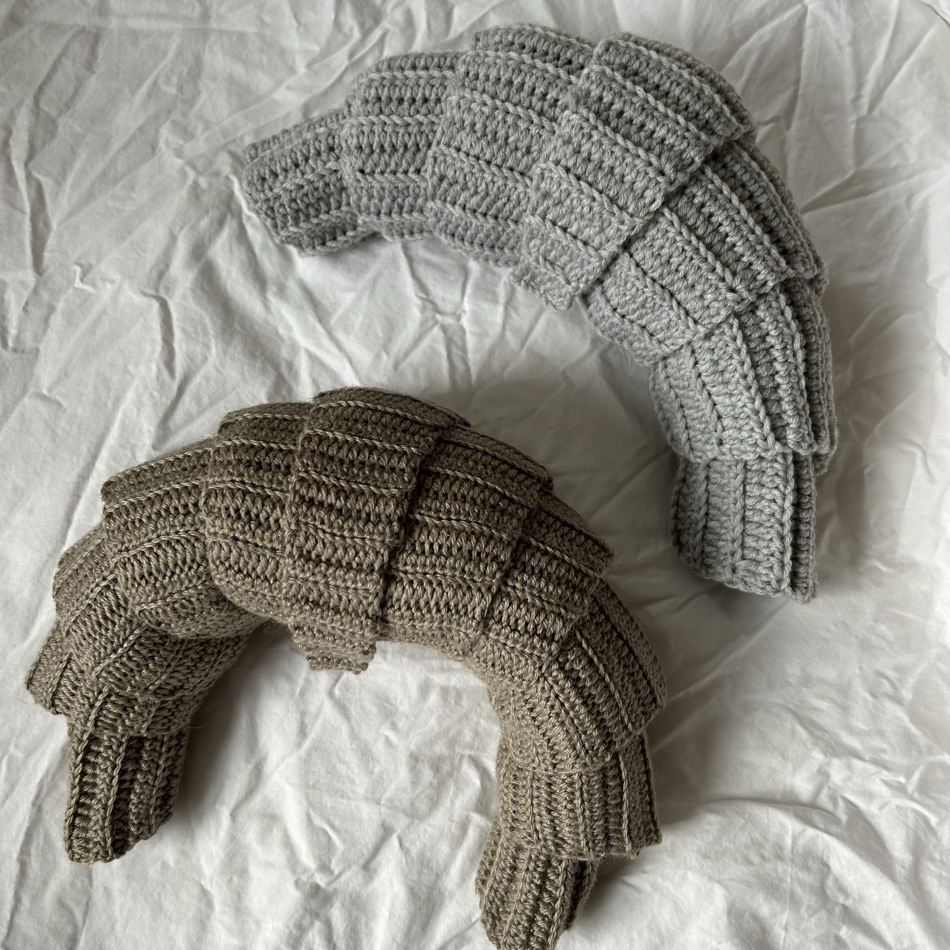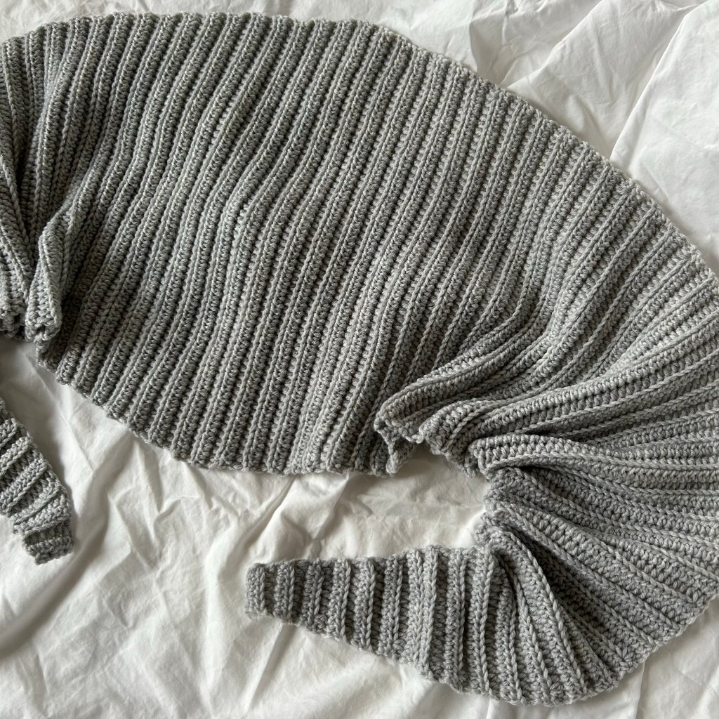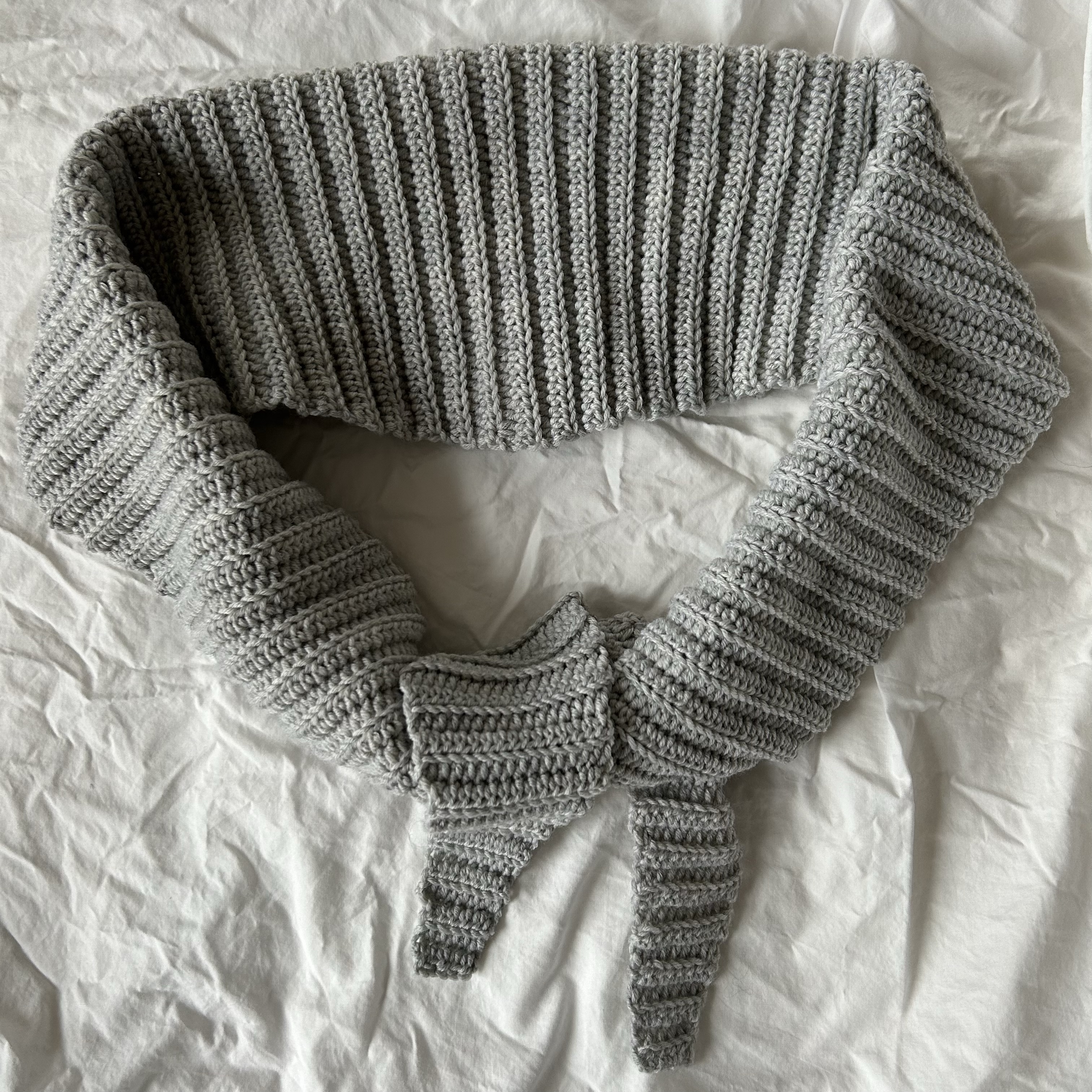 Das graue Tuch habe ich aus Lana Grossa Cool Wool Big und einer 4,0 mm gehäkelt. Das ist etwas kompakter und dicker. Eigentlich sollte die Wolle zu einer weiteren Mütze Ove (hier zur Anleitung) werden, aber das klappte weniger gut. Das Ergebnis wurde einfach zu fest und zu kompakt. Also habe ich daraus noch ein Tuch gemacht.